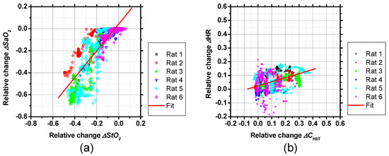 Scatter plots of relative changes in (a) SaO2 vs. StO2 and (b) CHbT vs. HR, obtained from the six rats.