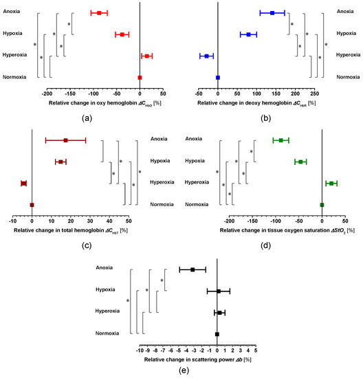 Relative change in (a) oxygenated hemoglobin ∆CHbO, (b) deoxygenated hemoglobin ∆CHbR, (c) total hemoglobin ∆CHbT, (d) hemoglobin oxygen saturation ∆StO2, and (e) scattering power b averaged over the ROIs for all six samples under conditions of hyperoxia, hypoxia, and anoxia. Error bars show standard deviations (n = 6). * p < 0.01.