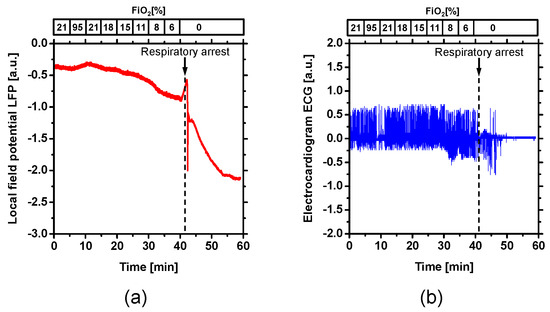 Figure 5 shows the typical time courses of electrocardiogram (ECG) and LFP during changes in FiO2. The ECG signal was irregularly disrupted immediately after respiratory arrest, whereas LFP rapidly dropped after respiratory arrest. This decrease in LFP is called anoxic depolarization (AD), and is related to brain tissue damage [36,37].