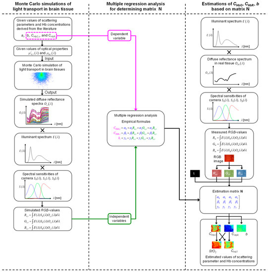 Figure 6 shows the flow of estimation by this method. In this method, values of CHbO, CHbR, and b are estimated from the values of Rm, Gm, and Bm by multiplication with matrix N as for each pixel of the image. Specifying the elements of matrix N based on Equations (1)–(6) is difficult because p (μs′, μa, l) and l are usually unavailable. We therefore simulated 450 diffuse reflectance spectra Om (λ) in the wavelength range of 400 to 700 nm at 10-nm intervals with MCS of light transport [7] in brain tissue. The simulation model used here consisted of a single layer of brain tissue in which absorption and scattering properties were uniformly distributed. The MCS used in this study is a method for modeling light propagation in biological tissues and is able to solve the radiative transport equation stochastically. The simulation is based on the random walks made by photons as they propagate through tissue, which are chosen by statistically sampling probability distributions for step size ∆l and angular deflection per scattering event. The value of ∆l represents the distance between two successive interactions, or scattering in the tissue. The MCS is based on macroscopic optical properties such as the absorption coefficient spectrum μa (λ) and the effective scattering coefficient spectrum μs′ (λ), which are assumed to extend uniformly over tissue volume. Once a photon with initial intensity I0 is launched in the tissue, it is moved to a step size where it may be scattered, absorbed, internally reflected, or transmitted out of the tissue.