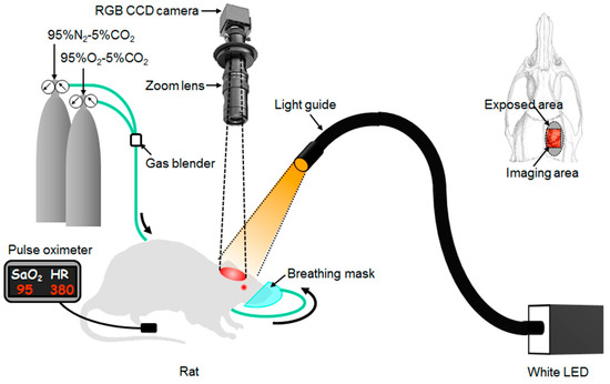 Animal care and experimental procedures were approved by the Animal Research Committee of Tokyo University of Agriculture and Technology (Approval number 22-28, 07 May 2010 and Approval number 23-67, 21 October 2011). Six adult male Wistar rats (body weight, 202 to 402 g) were anesthetized with 5.0% isoflurane and maintained with 2.0% isoflurane. The rat’s head was placed in a stereotaxic frame. A longitudinal incision of approximately 20 mm in length was made along the midline of the head. The skull bone overlying the parietal cortex was removed with a high-speed drill to form an ellipsoidal cranial window (major axis, 8.0 mm; minor axis, 6.0 mm). The cranial window was bathed with normal saline. Respiratory condition was changed by regulating the FiO2 with the mixture of 95%O2-5%CO2 gas and 95%N2-5%CO2 gas and monitored by an oxygen gas sensor. The sequential RGB images measured were used to estimate images of CHbO, CHbR, CHbT, StO2 and b according to the process described in Figure 6. Simultaneously with optical imaging for cerebral tissue, arterial oxygen saturation (SaO2) and heart rate (HR) were measured by a pulse oximeter (MOUSEOX Pulse Oximeter; Star Life Science, Oakmont, PA) as systemic physiological parameters. During experiments, the presence of respiration of the rat was monitored by observing periodical movements of the lateral region of the abdomen to check for respiratory arrest.