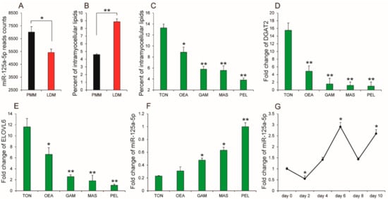 miR-125a-5p was negatively associated with porcine intramuscular fat (IMF) content. (A) The relative expression levels of miR-125a-5p in psoas major muscle (PMM) and longissimus dorsi muscle (LDM) (n = 3 per sample); (B) content of porcine IMF in PMM and LDM (n = 3 per sample); (C) IMF content in tongue (TON), obliquus externus abdominis (OEA), gastrocnemius muscle (GAM), masseter (MAS), and peroneal longus (PEL) (n = 3 per sample); (D–F) expression levels of diacylglycerol O-acyltransferase 2 (DGAT2), ELOVL fatty acid elongase 6 (ELOVL6) and miR-125a-5p in TON, OEA, GAM, MAS, and PEL (n = 3 per sample); (G) the relative expression levels of miR-125a-5p during porcine intramuscular preadipocytes differentiation (n = 3 per sample per time point). All results are presented as mean ± SEM. * p < 0.05; ** p < 0.01.