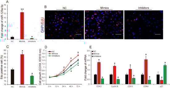Cyclin-dependent kinases (CDKs) such as cyclin-dependent kinases 2 (CDK2) and cyclin-dependent kinases 3 (CDK3) have been recognized as key regulators of cell growth and proliferation in eukaryotes, which are required for G1-to-S phase transition in mammalian cells [,]. Cell cycle protein B (Cyclin B) is necessary for the progression of the cells into and out of the M phase of the cell cycle []. Conversely, overexpression of cyclin-dependent kinase inhibitor 1A (p21) may inhibit cell proliferation by causing cell cycle arrest, which is an inhibitor of CDKs []. To confirm whether miR-125a-5p mediation of the porcine intramuscular preadipocyte proliferation is associated with these factors, we compared gene expression in cells transfected, respectively, with miR-125a-5p mimics, inhibitors, or NC. As shown in Figure 2E, qRT-PCR analysis illustrated that overexpression of miR-125a-5p significantly up-regulated the expression levels of CDK2, CDK3, CDK4 and Cyclin B, and inhibition of miR-125a-5p strongly down-regulated the expression of these genes. Additionally, overexpression or inhibition of miR-125a-5p caused a decrease or an increase in the expression of p21 in porcine intramuscular preadipocytes, respectively. Taken together, all results suggest that miR-125a-5p might inhibit proliferation of porcine intramuscular preadipocytes.