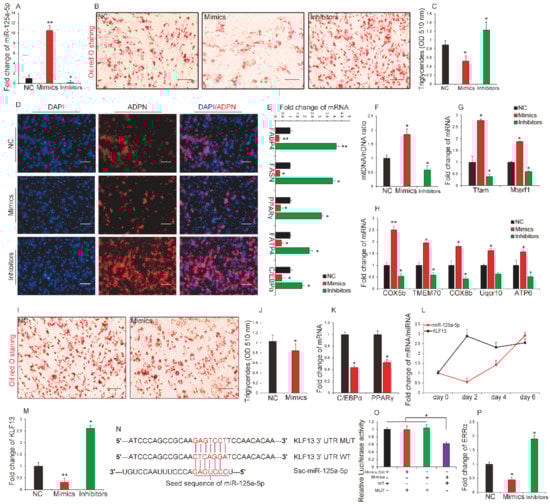 Next we identified the functional role of miR-125a-5p during porcine intramuscular preadipocytes differentiation. Transfection efficiency is shown in Figure 3A. We observed that overexpression of miR-125a-5p significantly inhibited intramuscular preadipocyte differentiation as determined by measuring the Oil Red O staining signal (Figure 3B) and triglycerides (TG) contents (Figure 3C) at day 8 of preadipocyte differentiation. By contrast, inhibition of miR-125a-5p had an opposite effect on the differentiation of porcine intramuscular preadipocytes compared with miR-125a-5p overexpression. In addition, by performing immunofluorescence of adiponectin and qRT-PCR analysis, we observed that transfection of miR-125a-5p mimics for 8 days significantly repressed the expression levels of adipogenic marker including adiponectin, CCAAT/enhancer binding protein α (C/EBPα), peroxisome proliferator activated receptor γ (PPARγ), adipocyte fatty acid-binding protein 4 (FABP4), and fatty acid synthase (FASN) while transfection of miR-125a-5p inhibitors remarkably promoted the expression of these factors when compared with the control group (Figure 3D,E). These results suggest that miR-125a-5p may play a negatively functional role during porcine intramuscular preadipocyte differentiation. Lipid metabolism is a continuum from emulsification and uptake of lipids in the intestine to cellular uptake and transport to compartments such as mitochondria []. Increasing mitochondrial biogenesis in white adipose tissues can impair white adipocyte formation and enhance energy output in the form of heat [,]. Recently, Maude et al. [] reported that miR-125b could affect mitochondrial biogenesis. These findings gave us a hypothesis that miR-125a-5p may accelerate the expenditure of porcine intramuscular adipocytes by increasing mitochondrial biogenesis. To test this hypothesis, porcine intramuscular preadipocytes were induced to differentiate for four days and were then transfected, respectively, with miR-125a-5p mimics, inhibitors, or NC. After four days of transfection, we measured mitochondrial content by calculating the ratio of mitochondrial DNA:nuclear DNA (mtDNA:nDNA). As shown in Figure 3F, overexpression of miR-125a-5p promoted mitochondrial biogenesis in adipocytes while inhibition of miR-125a-5p suppressed mitochondrial biogenesis in porcine intramuscular adipocytes when compared with the control group. Consistent with changes in mitochondrial biogenesis, genes related to mitochondrial biogenesis (Mterf1, Mitochondrial transcription termination factor 1; Tfam, Transcription factor A) (Figure 3G) and mitochondrial energy metabolism (Cox5b, Cytochrome c oxidase subunit Vb; TMEM70, Transmembrane protein 70; Cox8b, Cytochrome c oxidase subunit VIIIb; Uqcr10, Ubiquinol-cytochrome c reductase, complex III subunit X; and ATP6, ATP synthase F0 subunit 6) (Figure 3H) were expressed at higher or lower levels in adipocytes transfected with miR-125a-5p mimics or inhibitors, respectively. In addition, along with the increasing or decreasing of mitochondria, transfection of miR-125a-5p mimics significantly decreased the number of oil red O+ cells (Figure 3I), triglyceride content (Figure 3J), and expression levels of two key transcriptional regulators of adipogenesis called C/EBPα and PPARγ (Figure 3K). The findings suggest that miR-125a-5p may accelerate IMF expenditure in pork products by enhancing mitochondrial biogenesis and energy metabolism. Taken together, these results suggest that miR-125a-5p could inhibited differentiation of porcine intramuscular preadipocytes.
