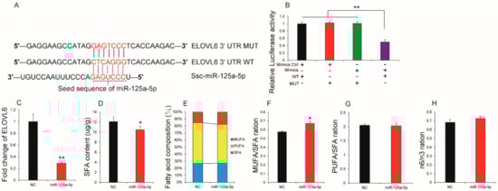 miR-125a-5p affected fatty acid composition in porcine intramuscular adipocytes. (A) Sequence alignment of Ssc-miR-125a-5p with 3′-UTR of porcine ELOVL6 mRNA; (B) Luciferase assays revealed the repressive effect of miR-125a-5p on the activity of ELOVL6 (n = 7 per treatment). After porcine intramuscular adipocytes were transfected with mimics or NC; (C) the expression levels of ELOVL6 (n = 3 per treatment); (D) Saturated fatty acids (SFA) content in mimics group and control group (n = 3 per treatment); (E) Fatty acid composition difference (n = 3 per treatment); (F) monounsaturated fatty acids (MUFA)/SFA ration (n = 3 per treatment); (G) polyunsaturated fatty acids (PUFA)/SFA ration (n = 3 per treatment); (H) n-6/n-3 ration (n = 3 per treatment). All results are presented as mean ± SEM. n = 3. * p < 0.05; ** p < 0.01.