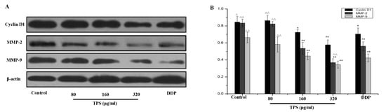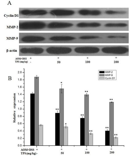 2.3. TPS Inhibited the Expression of Cyclin D1, MMP-2, and MMP-9 in CAC Mice
