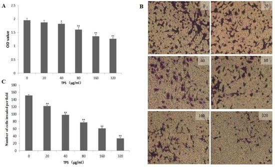 2.4. Effect of TPS on Cell Proliferation and Invasion of CT26 Cells In Vitro