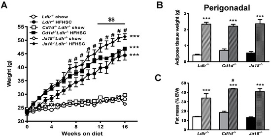 Invariant natural killer T (iNKT) cell deficient Ja18−/−Ldlr−/− mice exhibit increased weight gain. (A) Significantly increased weight gain in Ja18−/−Ldlr−/− mice fed high fat, high sucrose cholesterol enriched (HFHSC) diet for 16 weeks; (B) Perigonadal adipose tissue weights; (C) Body composition analysis revealed increased generalized fat distribution in all groups of obese mice. Data represent means ± standard error of the mean (SEM), n = 10 mice per group. *** p < 0.001 vs. lean mice of corresponding group, # p < 0.01 vs. HFHSC-fed Ldlr−/− mice, $$ p < 0.001 vs. HFHSC-fed Cd1d−/−Ldlr−/− mice. Open symbols and solid bars—chow-fed animals; closed symbols and hatched bars—HFHSC-fed animals. BW: body weight.