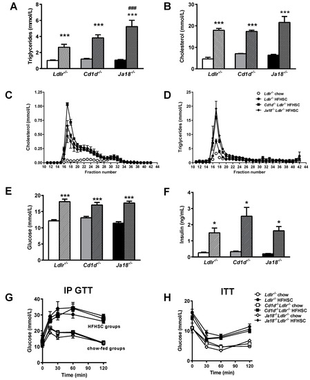 Effects of NKT cell deficiency on metabolic abnormalities that accompany obesity. (A) Plasma triglyceride and (B) cholesterol levels in mice fed chow or HFHSC diets. Plasma lipoprotein cholesterol (C) and triglyceride (D) distribution in lean Ldlr−/− and HFHSC-fed Ja18−/−Ldlr−/−, Cd1d−/−Ldlr−/−, and Ldlr−/− mice. (E) Plasma fasting glucose, (F) fasting insulin, and (G) intraperitoneal (ip) glucose tolerance test. (H) Insulin tolerance test. n = 10 per group. * p < 0.05 vs. corresponding lean mice, *** p < 0.001 vs. corresponding lean mice, ### p < 0.0001 vs. HFHSC-fed Ldlr−/− mice. Open symbols and solid bars—chow-fed animals; closed symbols and hatched bars—HFHSC-fed animals.