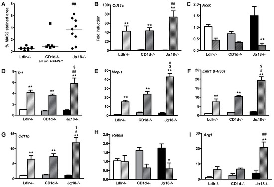 Since activated iNKT cells interact with tissue macrophages [28], we examined whether the absence of iNKT cells influences the macrophage content and inflammatory state of adipose tissue. Obese Ja18−/−Ldlr−/− mice accumulated more macrophages in perigonadal (intra-abdominal) adipose tissue compared to controls, as demonstrated by increased immunostaining for the macrophage specific protein Mac2 (p < 0.01, Figure 3A). In addition, the expression of Cd11c, which is found on macrophages and other immune cells, such as dendritic cells and natural killer cells, is also increased (Figure 3B). Analysis of gene expression in whole adipose tissue revealed that obese Ja18−/−Ldlr−/− mice had significantly reduced expression of adiponectin and increased Tnfa, compared to their lean counterparts (Figure 3C,D). The obese Ja18−/−Ldlr−/− mice also showed increased expression of the monocyte chemotactic factor 1 (Mcp1) gene (Figure 3E) and macrophage specific genes, such as Emr1 (F4/80) and Cd11b (Figure 3F,G), when compared to control Ldlr−/− and Cd1d−/−Ldlr−/− mice. Overall, the accumulated macrophages showed a phenotype of pro-inflammatory M1 activation, as evidenced by increased Tnfα expression with decreased expression of Retnla (Figure 3H), an anti-inflammatory activation M2 marker. However, Arg1, a M2 activation marker, is increased in the adipose tissue from the obese Ja18−/−Ldlr−/− mice (Figure 3I). Taken together, these findings indicate an increase in adipose inflammatory changes in obese Ja18−/−Ldlr−/− mice lacking iNKT cells.
