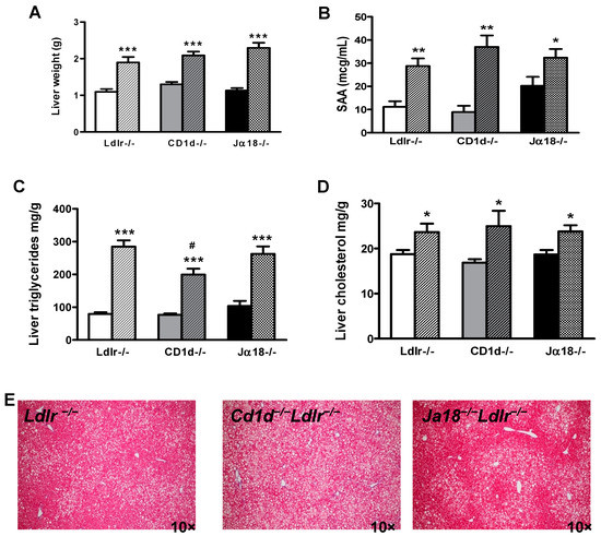 Effects of NKT cell deficiency in liver. (A) Liver weights, (B) plasma SAA levels, and hepatic triglyceride (C), and cholesterol (D) content. (E) Liver sections stained with Masson’s trichrome, 10× magnification. (F–I) Expression level of genes in whole liver tissue expressed as relative to lean chow-fed Ldlr−/− mice. n = 10 per group. * p < 0.05, ** p < 0.01, *** p < 0.001 vs. corresponding lean group, # p < 0.05 vs. HFHSC-fed Ldlr−/− mice. Solid bars—chow-fed animals; hatched bars—HFHSC-fed animals. SAA: serum amyloid A.