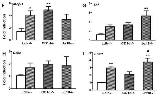 2.3. Adipose Tissue Inflammation Is Worsened in Obese Ja18−/−Ldlr−/− Mice Devoid of iNKT Cells