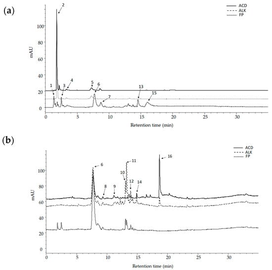 Base peak HPLC chromatograms at (a) 280 nm and (b) 365 nm with the identification of phenolic compounds detected in free phenolic (FP), alkaline (ALK), and acid (ACD) fractions obtained from mango cv. Ataulfo peel.