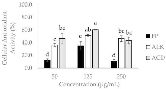 Cellular antioxidant activity (CAA) of the free phenolic (FP), alkaline (ALK), and acid (ACD) fractions obtained from mango cv. Ataulfo peel. Caco-2 cells were treated with 50, 125, and 250 µg/mL of each fraction for 20 min. Value are presented as mean ± standard deviation; a, b, c, d different letters above the bars indicate significant differences in the PC content between mango peel fractions (p < 0.05).