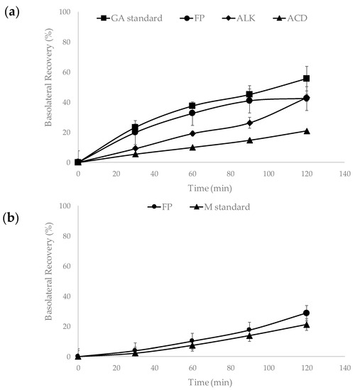 Basolateral recovery (%) of phenolic compounds from free phenolic (FP), alkaline (ALK) and acid (ACD) fractions obtained from mango cv. Ataulfo peel, gallic acid (GA), and mangiferin (M) standards, after permeability experiments in a Caco-2/HT-29 cell monolayer. (a) Basolateral recovery of gallic acid and (b) basolateral recovery of mangiferin.