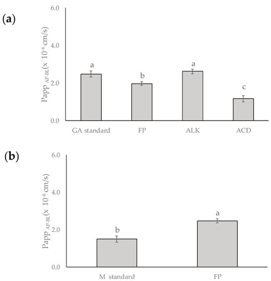 Apparent permeability (Papp) of (a) gallic acid (GA) and (b) mangiferin (M) present in free phenolic (FP), alkaline (ALK), and acid (ACD) fractions obtained from mango cv. Ataulfo peel, and their respective standards from apical to basolateral compartment (AP-BL).
