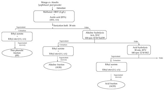 Schematic description of the extraction procedure to obtain free phenolic (FP), alkaline (ALK), and acid (ACD) fractions from mango cv. Ataulfo peel.