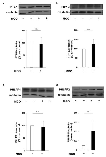 Employing an integrated approach using public bioinformatics tools, we have identified several phosphatases as potential targets of both miR-214 and miR-126. For this reason, we have tested the effects of MGO on the levels of the following proteins: PTP1B, which binds and subsequently dephosphorylates the insulin receptor [45]; the lipid phosphatase PTEN, which dephosphorylates PIP3 and antagonizes the PI3K signaling [46]; and the serine phosphatases PHLPP1 and PHLPP2, which specifically dephosphorylate Akt at the serine 473 residue and inactivate it [47,48,49]. Upon treatment with MGO, we have observed no alterations in the protein levels of PTP1B and PHLPP1 in MAECs. Surprisingly, despite PTEN being a widely validated target of miR-214 [38,39,40,41,42,43], its levels have not been altered by MGO in MAECs. One possible explanation for the lack of PTEN regulation by miR-214 in our cellular model is that the binding site for miR-214 in the 3′UTR of mouse PTEN overlaps with the binding site for several other miRNAs in accordance with the microRNA.org prediction, suggesting that other miRNAs highly expressed in MAECs may regulate PTEN in a mutually exclusive fashion and independently from any changes in miR-214 levels upon MGO treatment.