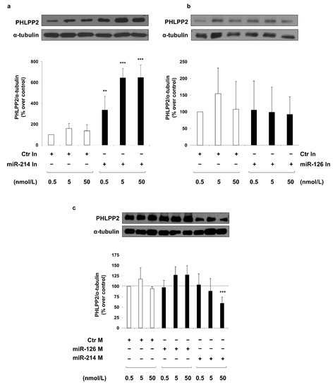 Effect of miR-214 and miR-126 modulation on PHLPP2 protein levels in MAECs. MAECs were transfected with different concentrations (0.5, 5, and 50 nmol/L) of miR-214 (a) and miR-126 (b) inhibitor (miR-214 In and miR-126 In), or miR-214 and miR-126 mimic (miR-214 M and miR-126 M) (c). Transfection with a non-targeting antisense inhibitor (Ctr In; (a,b)), and a non-targeting control oligonucleotide (Ctr M; (c)) were used as negative controls. Forty-eight hours after transfection, cells were collected and protein lysates were analyzed by Western blot with anti-PHLPP2 and anti-α-tubulin antibodies. Exposure timing was 4 min for blots in panels (a), 2 min for blots in panels (b) and 20 min for blots in panel (c). Protein levels were quantified by the densitometric analysis of at least three independent experiments. Bars in the graphs represent the mean ± SD of the percent (%) over control (Ctr In or Ctr M) 0.5 nmol/L. Statistical analysis was evaluated using Student’s t-test; ** p ≤ 0.01; *** p ≤ 0.001.