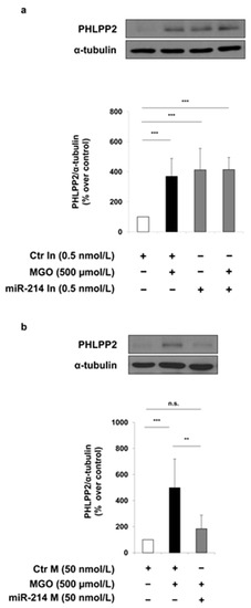 In order to strengthen the role of miR-214 in the MGO effect on the PHLPP2 levels in MAECs, this miRNA has been both inhibited and overexpressed in presence of MGO. While no further increase is observed in the former case, thus excluding that two different mechanisms are due to miR-214 and MGO, a reversion in the PHLPP2 expression is obtained when the MGO-dependent downregulation of miR-214 is specifically bypassed in the latter case.