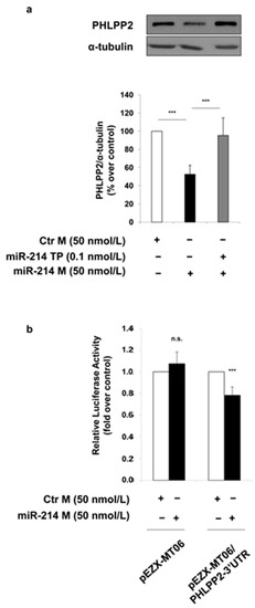 Effect of miR-214 on PHLPP2 regulation. (a) MAECs were transfected with a non-targeting control oligonucleotide (Ctr M; white bars) or miR-214 mimic (miR-214 M 50 nmol/L; black bars). Where indicated, MAECs were co-transfected with miScript miR-214 Target Protector (miR-214 TP 0.1 nmol/L). Protein lysates obtained from 48 h transfected MAECs were analyzed by Western blot with anti-PHLPP2 and anti-α-tubulin antibodies. Exposure timing of blots was of 2 min. Protein levels were quantified by the densitometric analysis of at least three independent experiments. Bars in the graphs represent the mean ± SD of the percent (%) over control (Ctr M). (b) MAECs were transfected for 24 h with non-targeting control oligonucleotide (Ctr M 50 nmol/L; white bars) or miR-214 mimic (miR-214 M 50 nmol/L; black bars) in the presence of the pEZX-MT06 control reporter vector or the pEZX-MT06/PHLPP2-3′UTR reporter vector. Firefly and Renilla luciferase activities were determined in cell lysates under each experimental condition. Results are normalized to Renilla activity. Bars in the graphs represent the mean ± SD of the fold over control (Ctr M). Statistical analysis was evaluated using Student’s t-test; *** p ≤ 0.001.