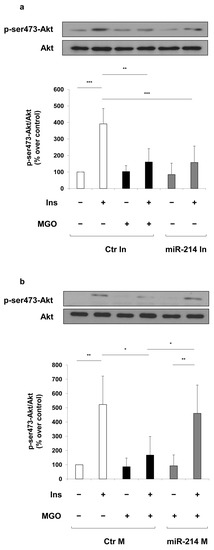 Finally, to prove the role of miR-214 on endothelial MGO-mediated insulin-resistance, we analyzed the effect of miR-214 inhibitor and miR-214 mimic on insulin-dependent phosphorylation of Akt. As shown in Figure 5, MGO treatment in MAECs transfected with control inhibitor induces a reduction of insulin-induced Akt phosphorylation compared to the same cells not exposed to MGO. Similarly, the transfection of MAECs with miR-214 inhibitor significantly decreases insulin-stimulated Akt phosphorylation compared to MAECs transfected with control inhibitor (Figure 5a). Differently, the transfection of miR-214 mimic prevents the MGO deleterious effect on the insulin-dependent Akt phosphorylation (Figure 5b).