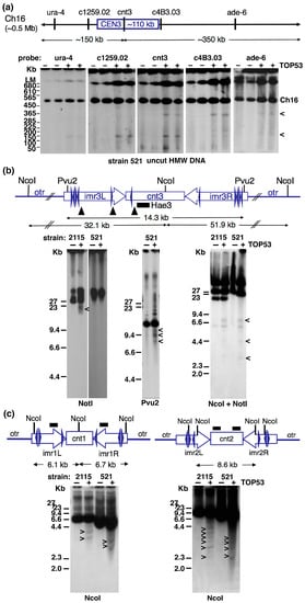 - Murakami, S.; Yanagida, M.; Niwa, O. A large circular minichromosome of Schizosaccharomyces pombe requires a high dose of type II DNA topoisomerase for its stabilization. Mol. Gen. Genet. 1995, 246, 671–679. [Google Scholar] [CrossRef] [PubMed]