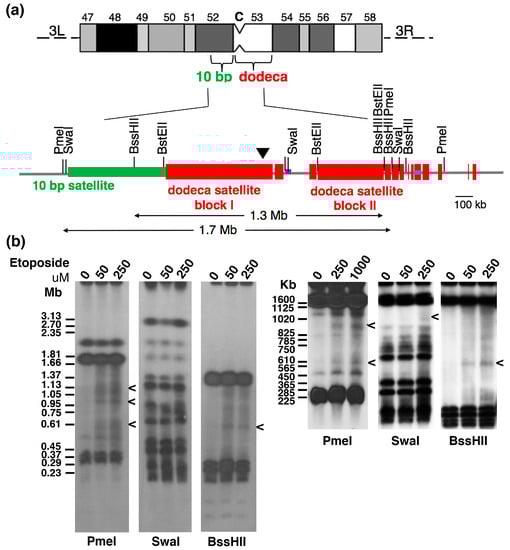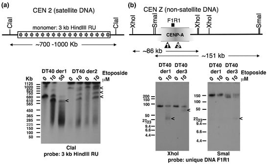 - Spence, J.M.; Fournier, R.E.; Oshimura, M.; Regnier, V.; Farr, C.J. Topoisomerase II cleavage activity within the human D11Z1 and DXZ1 alpha-satellite arrays. Chromosome Res. 2005, 13, 637–648. [Google Scholar] [CrossRef] [PubMed]