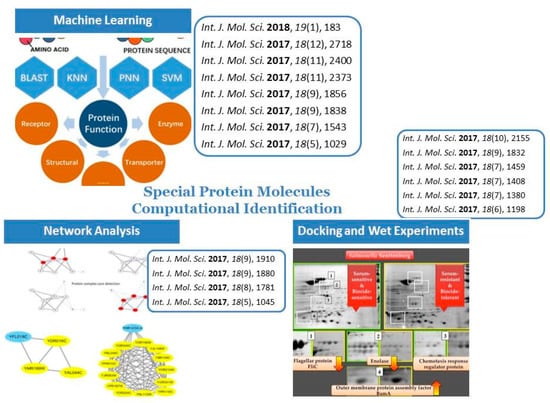 To conclude, papers in this special issue cover several emerging topics of computational identification and bioinformatics analysis of special protein molecules. We fervently hope that this particular issue will attract considerable interest in the relevant fields. We are grateful to Int. J. Mol. Sci. for providing the chance to organize this special issue. We also thank the reviewers for their efforts in guaranteeing the high quality of this special issue. Finally, we thank all those who contributed to this special issue. Int. J. Mol. Sci. has promised to continue with the same topic as a new special issue in 2018. Besides special protein molecules, nucleic acids with special modifications identification (such as RNA m6A [], protein phosphorylation [] and methylation, etc.) will also be welcomed in the 2018 special issue. I hope more authors and readers will contribute, especially to the follow-up works from this special issue.