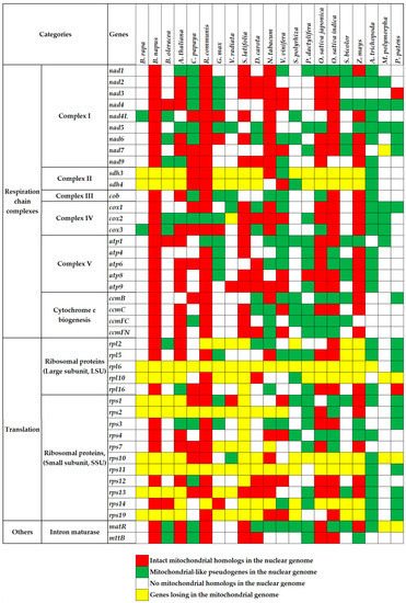 Genes identified to transfer in and out of the mitochondrial genome or genes lost from the mitochondrial genome of 21 land plants. The first two columns are mitochondrial protein-encoding genes (the second column) and their functional categories (the first column). The first line lists the names of plant species. The red and green cells represent mitochondrial full-length intact homologs and pseudogenes in nuclear genomes, respectively. The white and yellow cells represent no mitochondrial homologs in nuclear genomes and genes lost from mitochondrial genomes, respectively.