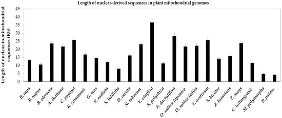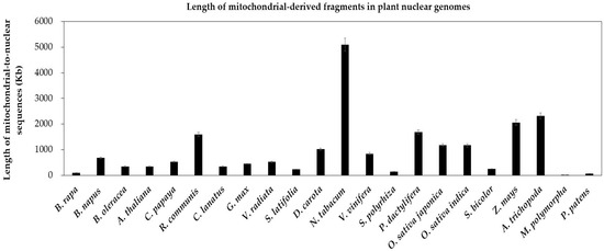 Length of mitochondrial-derived fragments in plant nuclear genomes. The plant species are arrayed on the horizontal axis. The total lengths of mitochondrial-to-nuclear sequences are along the vertical axis. The bars represent the lengths of sequences transferring from the mitochondrion to the nucleus in plant species. The error bars stand for the positive and negative deviations of 5.0%.
