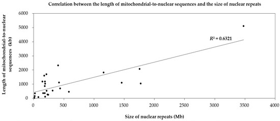 Correlation between the length of mitochondrial sequences transferring to the nucleus and repeat sizes of the nuclear genome in 22 land plants. Each dot represents a length value (X, Y). X refers to the size of the repeats in nuclear genomes of one species (based on the horizontal axis). Y means the length of mitochondrial-to-nuclear sequences in its corresponding species (based on the vertical axis). The slash represents the linear regression function of the distribution tendency of the dots. R2 is the regression coefficient.