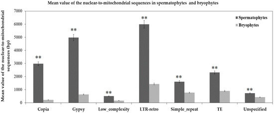 Mean value of the length of different nuclear sequences transferring to the mitochondrial genomes of spermatophytes and bryophytes. ** p < 0.01. The seven categories of repeats are arrayed on the horizontal axis. The total lengths of nuclear-to-mitochondrial repetitive sequences are along the vertical axis. The dark gray and light gray bars represent the mean values of repeats transferring from the nucleus to the mitochondrion in 21 spermatophytes and 2 bryophytes, respectively. The error bars stand for the positive and negative deviations of 5.0%.