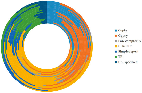 - Qiu, F.; Ungerer, M.C. Genomic abundance and transcriptional activity of diverse gypsy and copia long terminal repeat retrotransposons in three wild sunflower species. BMC Plant Biol. 2018, 18, 6. [Google Scholar] [CrossRef] [PubMed]