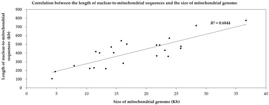 Correlation between the length of nuclear sequences transferring to the mitochondrion and the size of the mitochondrial genome in 23 land plants. Each dot represents a length value (X, Y). X refers to the length of the mitochondrial genome of one species (based on the horizontal axis). Y means the length of nuclear-to-mitochondrial sequences in this corresponding species (based on the vertical axis). The slash represents the linear regression function of the distribution tendency of the dots. R2 is the regression coefficient.