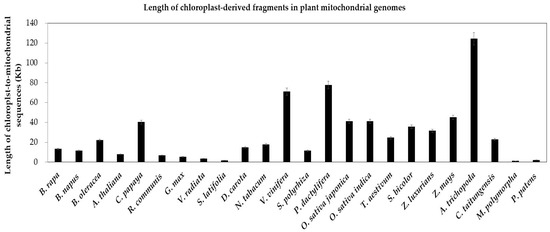 Length of chloroplast-derived fragments in plant mitochondrial genomes. The plant species are arrayed on the horizontal axis. The total lengths of chloroplast-to-mitochondrial sequences are along the vertical axis. The bars represent the lengths of sequences transferring from the chloroplast to the mitochondrion in species. The error bars stand for the positive and negative deviations of 5.0%.
