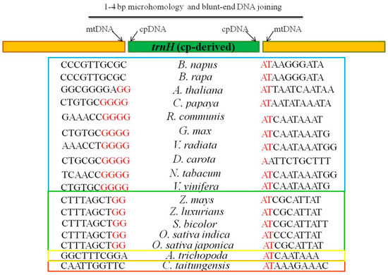 To infer the mechanism of chloroplast tRNA genes inserting into mitochondria, we analyze the flanking nucleotide sequences in insertion sites of mitochondrial genomes. trnH transferred in most spermatophytes (Figure 9). trnD moved specifically in eudicots (Figure S3). trnC and trnF migrated only in Gramineae crops (Figure S4). Taking together, we notice the micro-homologies (1 to 4 bp) among plant species in the breakpoint sequences of chloroplast-mitochondrial DNA fusion. The micro-homologies are the same adenine-thymine (AT) on the right of trnH in spermatophytes. But on the left are four short tandems Guanine (G) in eudicots, two repeated Guanine (G) in monocots and no microhomology in gymnosperms (Figure 9). Therefore, we confer that DNA sequence microhomology plays an important role in chloroplast DNA inserting into the mitochondrion, which may be the microhomology-mediated break-induced replication (MMBIR) [19] or non-homologous end joining (NHEJ) [20].