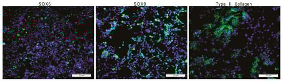 The cells were transferred into a 0.1% gelatin-coated 48-well plate for 48 h and then washed with phosphate buffered saline (PBS) (Sigma Aldrich, Saint Louis, MO, USA) and fixed for 20 min in 100% methanol (SOX6 and SOX9) (CHEMPUR, Piekary Slaskie, Poland) or 4% formaldehyde (type II collagen) (CHEMPUR, Piekary Slaskie, Poland) (400 μL of methanol/formaldehyde per well). Then, the cells were rinsed with PBS containing 1% bovine serum albumin (BSA) (Sigma Aldrich, Saint Louis, MO, USA) and incubated for 30 min in PBS containing 1% BSA and 0.2% Triton X-100 (Sigma Aldrich, Saint Louis, MO, USA). After 30 min, the cells were washed with PBS containing 1% BSA. The primary antibodies were diluted in PBS containing 1% BSA and 0.2% Triton X-100 and the cells were incubated overnight at 4 °C with the following primary antibodies (all from Abcam PLC, Cambridge, UK): type II collagen (1:100) (ab34712); SOX6 (1:50) (ab30455); SOX9 (1:50) (ab59252). After conjugation with the primary antibodies, the cells were rinsed three times with PBS containing 1% BSA. The following secondary antibody was diluted with 1% BSA in PBS and incubated in the dark for 1 h at 37 °C: rabbit polyclonal antibody (1:500) (711-546-152) (Jackson ImmunoResearch, Philadelphia, PA, USA). After the cells were washed three times with 1% BSA in PBS, they were stained for 5 min with diamidino-2-phenylindole dye (DAPI) (Sigma Aldrich, Saint Louis, MO, USA) solution in water (1:10,000) and then washed with PBS before undergoing microscope analysis.