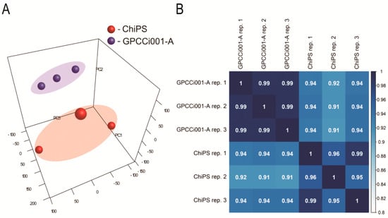 To perform a complete comparison of ChiPS and GPCCi001-A transcriptome profiles, we analyzed whole gene expression using Affymetrix Human Gene 2.1 ST ArrayStrips. These strips were used to examine the expression of 40,716 different transcripts. Principal component analysis (PCA) (Figure 2A) indicate a clear segregation of GPCCi001-A and ChiPS cells. The correlation coefficient analysis demonstrated that the expression differences at the whole transcriptome level are different between ChiPS and GPCCi001-A cells (Figure 2B).