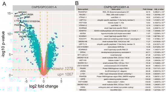 Volcano plots show the total gene expression profiles of the ChiPS and GPCCi001-A experimental groups. Each dot represents the mean expression level (n = 3) of a single gene obtained from a microarray normalized dataset. The orange dotted lines (cut off values) were established according to the following parameters: fold > |2| and adjusted p-value < 0.05. Genes above the cut-off are considered to be differentially expressed and are shown as blue dots. The total number of differentially expressed genes are displayed in the bottom right corner of the graph. The top ten most up- and down-regulated genes are described by their gene symbols (A). The table shows the 30 genes with the highest (15 genes) and lowest (15 genes) fold changes obtained from the list of differentially expressed genes (B).