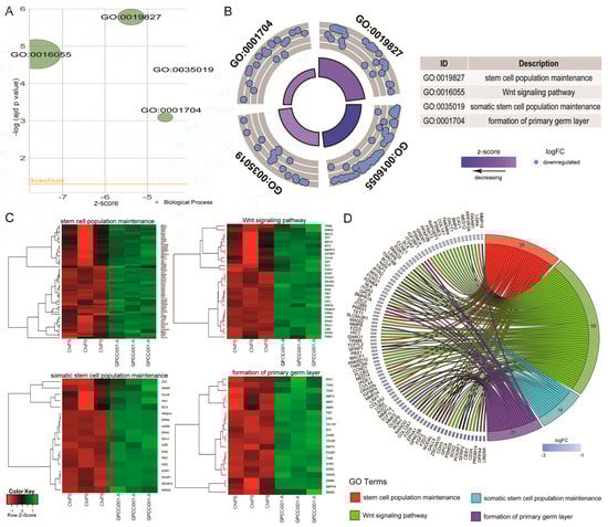 Bubble plot of four significantly-enriched Gene Ontology (GO) terms related to pluripotency regulation and differentiation, which were: “stem cell population maintenance”, “Wnt signalling pathway”, “somatic stem cell population maintenance”, and “formation of primary germ layer”. The negative logarithm of the adjusted p-value from all analyzed GO terms is given on the y-axis, while the Z-score value is shown on the x-axis (A). The circular scatter plot shows the differentially expressed genes assigned to each GO term. The logarithm of the fold change value (logFC) of differentially expressed genes is shown (B). Heat map graphs of genes from the following GO terms: “somatic stem cell population maintenance”, “stem cell population maintenance”, “formation of primary germ layer”, “Wnt signalling pathway”. Arbitrary signal intensity acquired from the microarray analysis is represented by the colours (green—higher; red—lower expression). Log2 signal intensity values for any single gene were resized to Row Z-Score scale. Genes belonging to the relevant GO term are described by their symbols (C). Circos plot demonstrating relationship between selected GO terms and their genes. Genes are located on the left side of the graph and indicated by their symbols. Genes were ordered based on their logFC values. Gene involvement in the GO terms was determined by connecting lines (D).