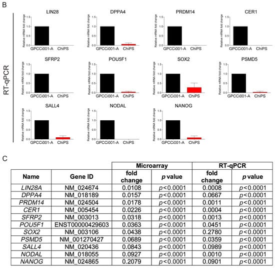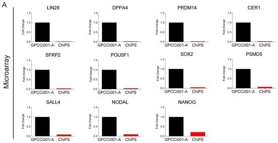 The accuracy of this study was verified by a detailed gene expression analysis (RT-qPCR) (Figure 5). In contrast to GPCCi001-A cells, ChiPS cells express genes involved in pluripotency and self-renewal at a very low level. ChiPS cells also present the downregulated expression of genes involved in the formation of primary germ layers. By contrast, the GPCCi001-A cells demonstrated a high expression of all of the evaluated genes.