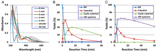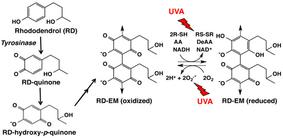 - Miyaji, A.; Gabe, Y.; Kohno, M.; Baba, T. Generation of hydroxyl radicals and singlet oxygen during oxidation of rhododendrol and rhododendrol-catechol. J. Clin. Biochem. Nutr. 2017, 60, 86–92. [Google Scholar] [CrossRef] [PubMed]