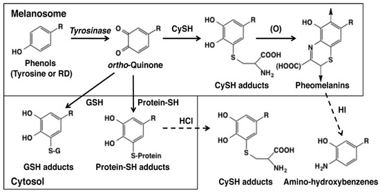 - Ito, S.; Okura, M.; Nakanishi, Y.; Ojika, M.; Wakamatsu, K.; Yamashita, T. Tyrosinase-catalyzed metabolism of rhododendrol (RD) in B16 melanoma cells: Production of RD-pheomelanin and covalent binding with thiol proteins. Pigment Cell Melanoma Res. 2015, 28, 295–306. [Google Scholar] [CrossRef] [PubMed]