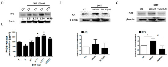 Prostaglandin D2 receptor (DP2) antagonist (TM30089) decreases dihydrotestosterone (DHT)-induced androgen receptor (AR) and prostaglandin expression in human dermal papilla cells (hDPCs). The mRNA expression of cyclooxygenase-2 (COX2), prostaglandin D2 synthase (PTGDS) and DP2 was examined in hDPCs treated with DHT for 24 h. The mRNA expression of COX2 (A), PTGDS (B) and DP2 (C) was induced by 100 nM DHT. DP2 protein expression was strongly induced by 100 nM DHT at 5 h (D). hDPCs were cultured for 24 h with DHT, as indicated. The level of PGD2 receptor in the supernatant was evaluated in three independent experiments (E). The relative mRNA levels were normalized to that of GAPDH. hDPCs were pretreated with 20 µM TM30089 for 1 h and then treated with 100 nM DHT for 5 h. The protein level of AR (F) and DP2 (G) was measured by western blot. TM30089 decreased the DHT-induced AR and DP2 expression. β-actin served as a loading control for protein normalization. The results are expressed as the mean ± SD of three independent experiments: CTL; control. * p < 0.05 compared with the control (0 nM DHT). # p < 0.05 compared with the DHT 100 nM.