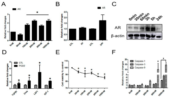 PGD2 regulates the AR expression and viability of hDPCs. hDPCs were cultured in serum-free DMEM for 24 h, and then treated with the indicated concentrations of PGD2 for 24 h (A). For optimal condition of AR mRNA expression, hDPCs were cultured in serum-free DMEM for 24 h, and then 200 nM PGD2 treated in hDPCs for 5 and 24 h (B). hDPCs were treated with PGD2 (200 nM) for the indicated times and harvested. The AR protein level was determined using western blot analysis (C). The mRNA expression of transforming growth factor beta 1 (TGFβ1), Creb, lymphoid enhancer binding factor 1 (LEF1) and insulin-like growth factor 1 (IGF-1) was measured by qRT-PCR (D). Cell viability was determined using 3-(4,5-dimethylthiazol-2-yl)-2,5-diphenyl-2-H-tetrazolium bromide (MTT) assay after incubation with different concentrations of PGD2 (0, 50, 100, 200, 500, 1000 nM) for 72 h (E). The mRNA expression of caspase-1, -3, and -9 was measured by qRT-PCR (F). The results are expressed as the mean ± SD of three independent experiments. * p < 0.05, compared with the control (0 nM PGD2).