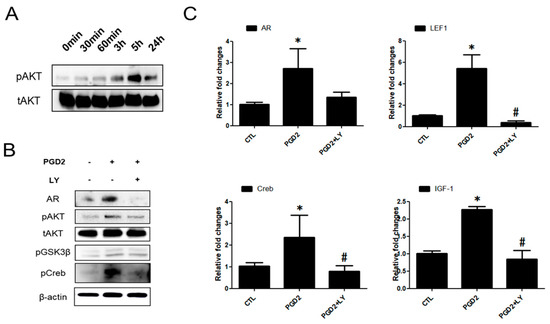 PGD2 regulates the AKT signal. The AKT phosphorylation was determined using western blot analysis. hDPCs were treated with PGD2 (200 nM) for the indicated times and harvested (A). hDPCs were pretreated with LY294002 for 1 h, and then PGD2 (200 nM) treatment for 5 h. The protein levels of AR, and AKT/GSK3β/Creb phosphorylation was measured using western blot analysis (B). The mRNA expression of AR, LEF1, Creb, and IGF-1 was measured using qRT-PCR (C). β-actin served as a loading control for protein normalization. GAPDH was used as an internal control for mRNA normalization. The results are expressed as the mean ± SD of three independent experiments. * p < 0.05, compared with the control (0 nM PGD2), # p < 0.05 compared with PGD2.