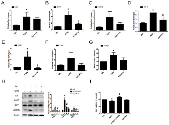 The effect of a DP2 antagonist on PGD2-induced AR related genes and AKT signalling in hDPCs. hDPCs were pretreated with TM30089 (20 µM) or LY294002 (20 µM) for 1 h and then stimulated with 200 nM PGD2 for 24 h. The mRNA expression of AR, DP2, COX2, IGF-1, LEF1, Creb, and TGFβ1 was measured by qRT-PCR (A–G). hDPCs in serum-free DMEM were pretreated with TM30089 (20 µM) for 1 h and then stimulated with 200 nM PGD2 for 5 h. The protein level of AR, and AKT/GSK3β phosphorylation was measured using western blot analysis. The histogram shows quantitative representation of the levels of PGD2-induced phosphorylation obtained from a densitometric analysis of three independent experiments (H). An MTT-based assay was performed to determine the effects of PGD2 after 72 h of treatment. TM30089 (20 µM) restored the viability of hDPCs that was inhibited by 200 nM PGD2 (I). β-actin served as a loading control for protein normalization. GAPDH was used as an internal control for mRNA normalization. The results are expressed as the mean ± SD of three independent experiments. TM; TM30089, * p < 0.05 compared with the control (0 nM PGD2), # p < 0.05 compared with PGD2.