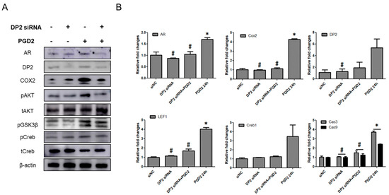 Knockdown of DP2 suppress AR related genes and AKT signal. After transfection with negative control (siNC) or DP2 siRNA, and then treated with PGD2 (200 nM) for 5 h. The protein levels of AR, DP2, COX2, and AKT/GSK3β/Creb phosphorylation was measured using western blot analysis (A). After transfection with siNA or DP2 siRNA for 24 h, and then treated with PGD2 (200 nM) for 24 h. The mRNA expression of AR, DP2, COX2, LEF1, Creb, and caspases (-3, and -9) was measured by qRT-PCR (B). β-actin served as a loading control for protein normalization. GAPDH was used as an internal control for mRNA normalization. The results are expressed as the mean ± SD of three independent experiments. * p < 0.05 compared with the siNC (siRNA negative control), # p < 0.05 compared with PGD2.