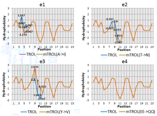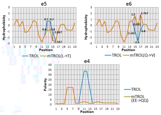 e1: 67Ala→67Ile, e2: 71Thr→71Asn, e3: 72Tyr→72Val, e4:73Glu74Glu→73Gln74Gln, e5: 76Leu→76Thr, e6:78Gln→78Val. Hydrophobicity was checked for each amino acid substitution, according to Kyte and Doolittle [23] (Figure 1). For substitutions 73Glu74Glu→73Gln74Gln, exchange polarity has been compared according to Zimmerman et al. [24] (Figure 1).